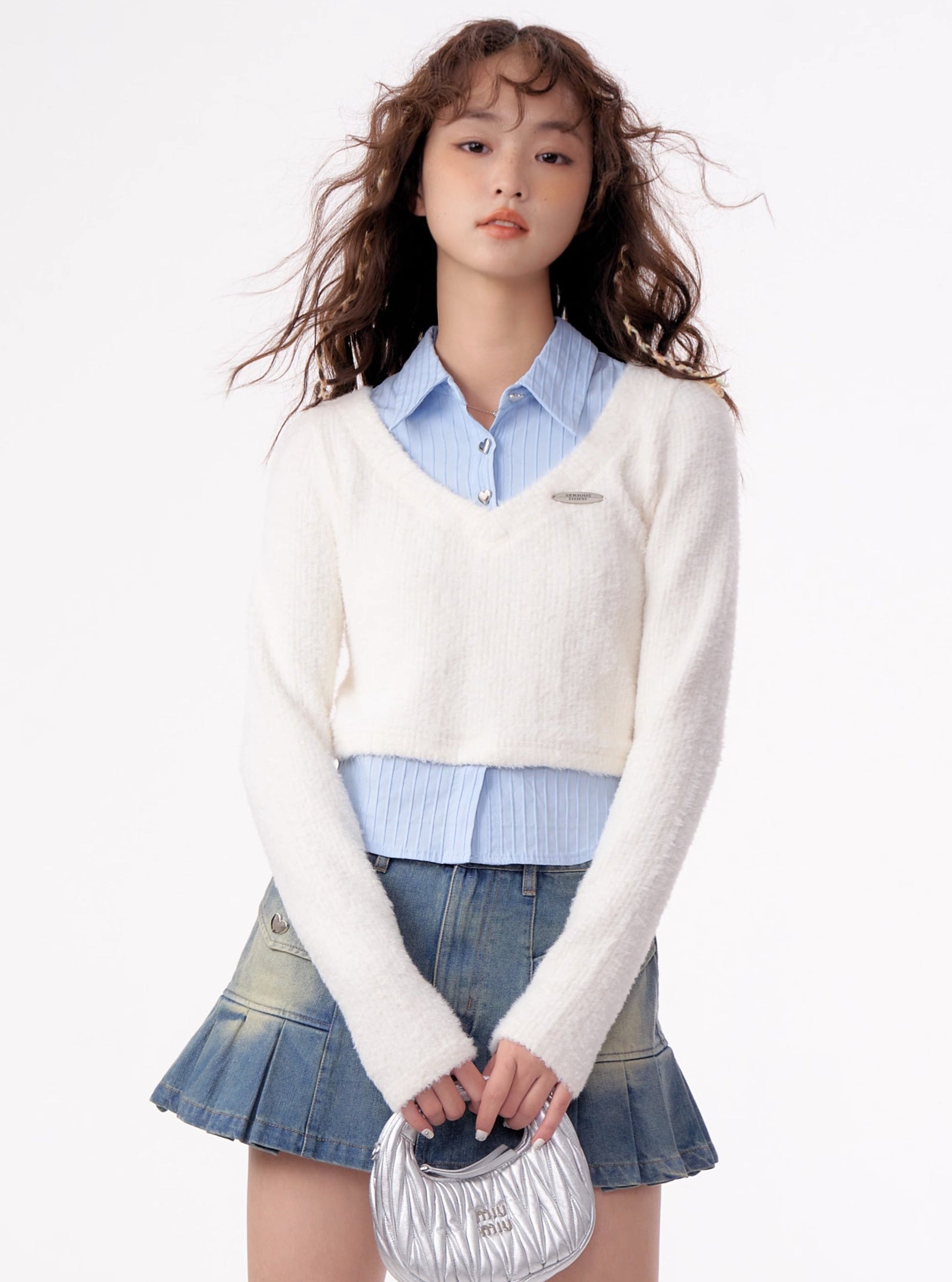 American vintage fake two-piece set long sleeve top