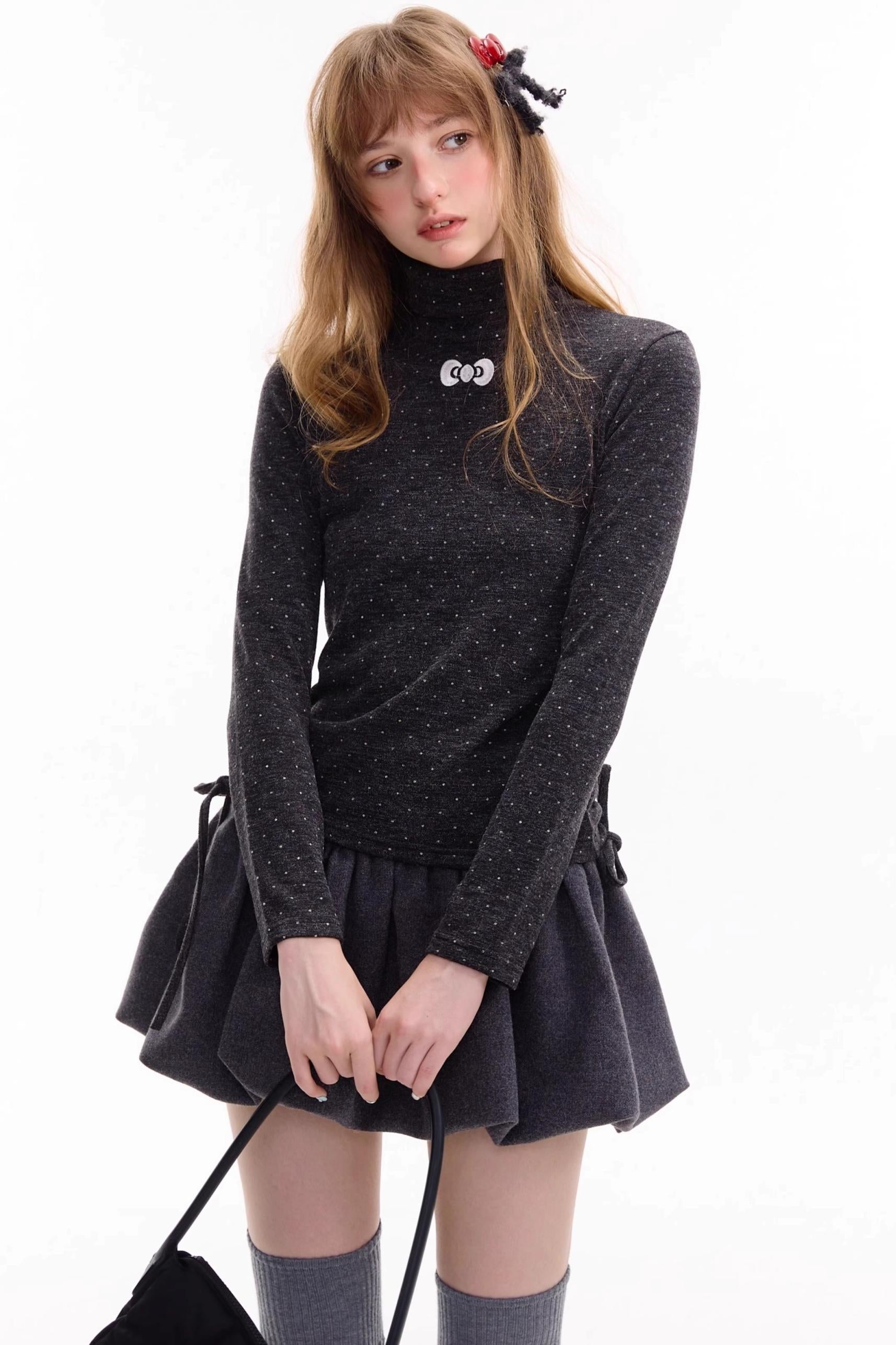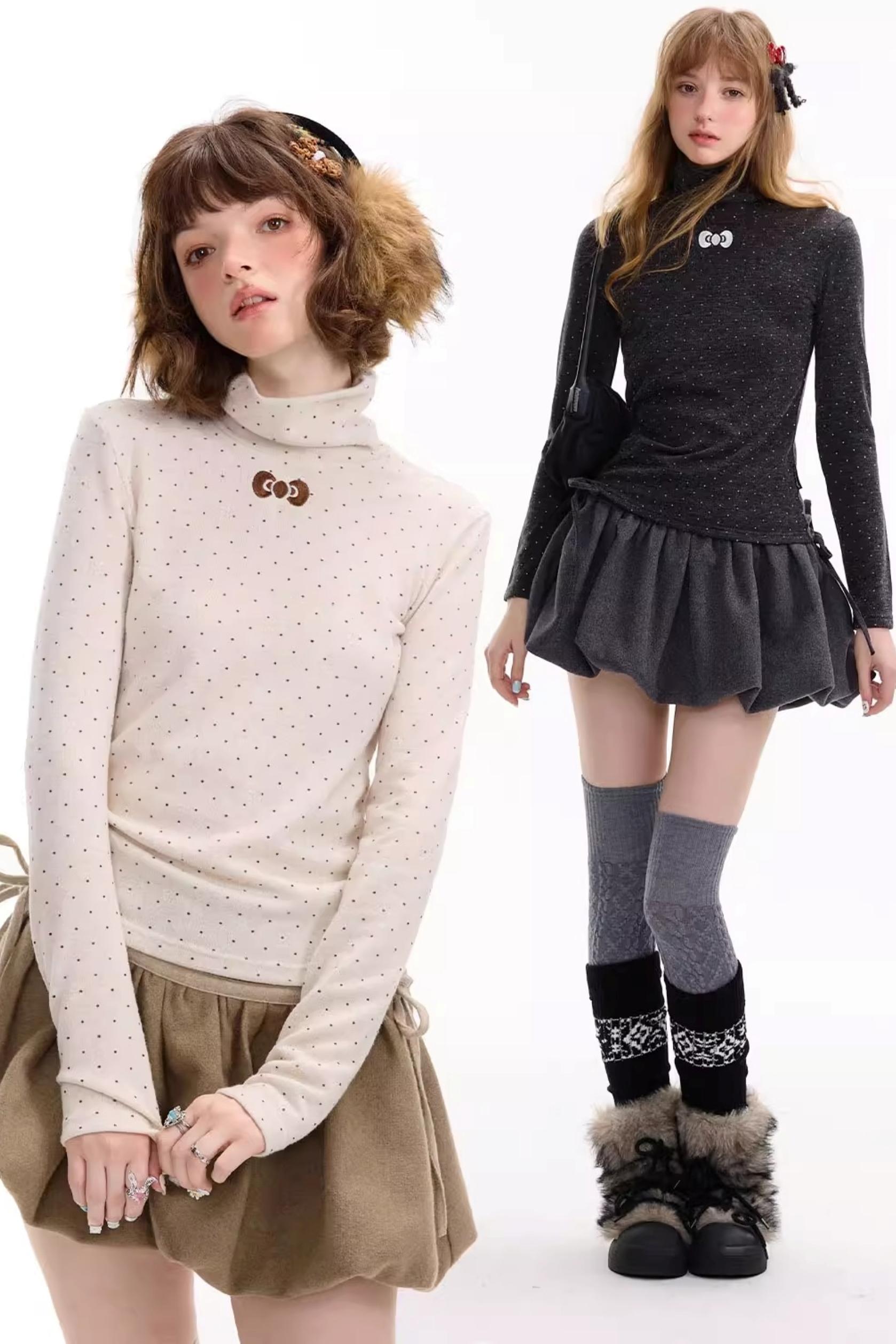 Retro Polka Dot High-Neck Long Sleeve T-Shirt